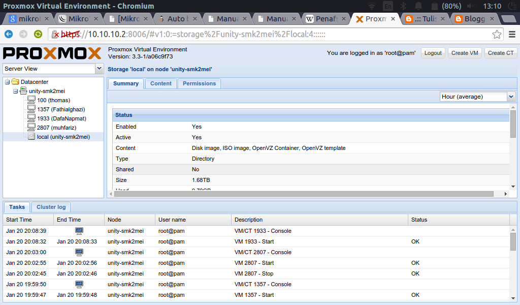 Setelah itu klik tanda tambah(+) pada unity-smk2mei dalam hal ini adalah nama proxmox yang diberi di server induk dan masuk ke local
